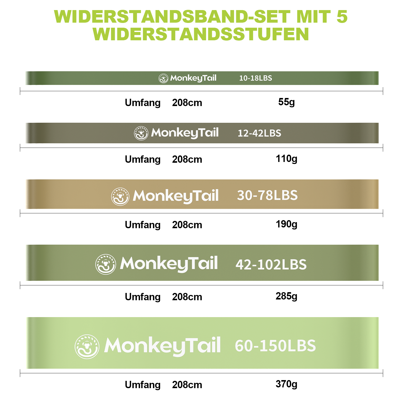 MonkeyTail Widerstandsbandset, 5 Stufen (unterschiedliche Intensitäten)
