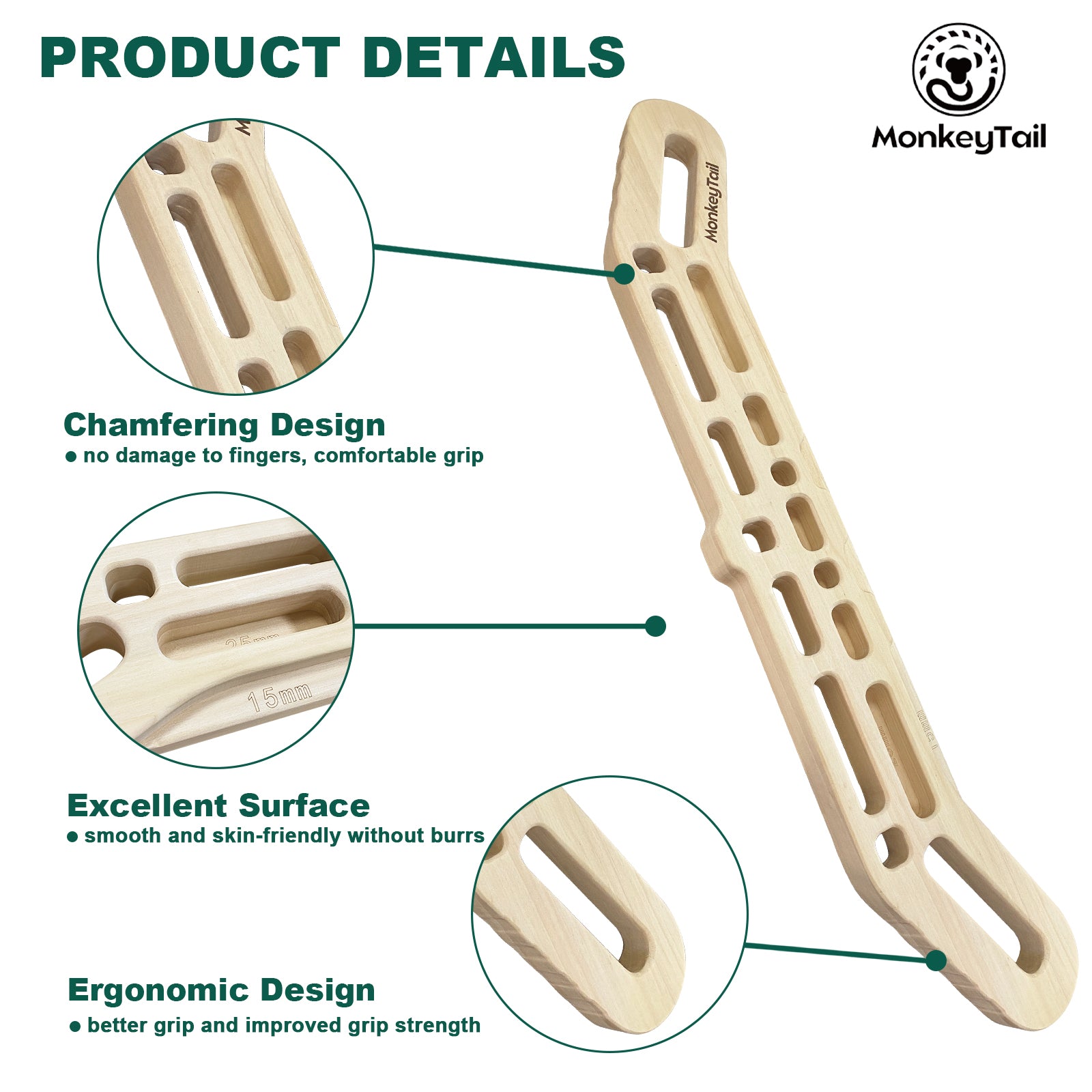 Independent And Innovative Design: MonkeyTail has upgraded the form of the hangboard with a new, ergonomically designed shape, strong webbing and handles that allow for a variety of hanging patterns, making the board multi-purpose.